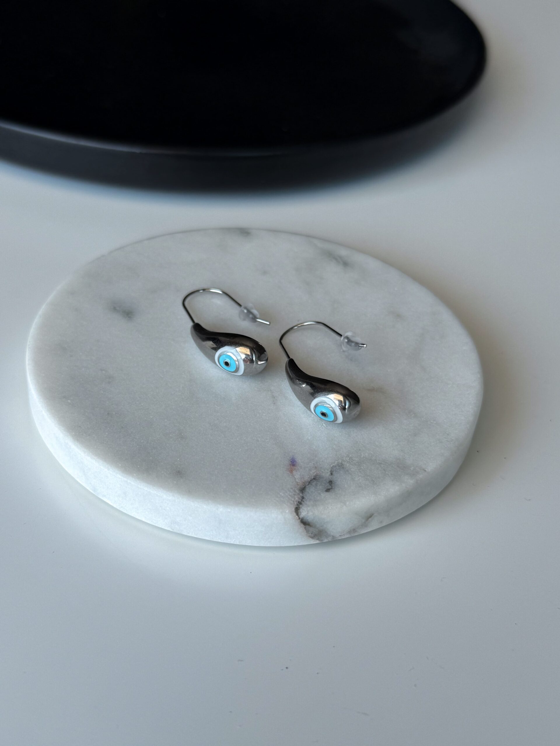 Προσθέστε μια δόση προστασίας και στυλ στην εμφάνισή σας με αυτά τα ασημί κρεμαστά σκουλαρίκια με ματάκι. Κατασκευασμένα από ανοξείδωτο ατσάλι, συνδυάζουν αντοχή, υποαλλεργικότητα και διαχρονική λάμψη. Ιδανικά για καθημερινή χρήση ή για να ολοκληρώσετε ένα εμφανισιακό σύνολο με πρωτότυπο και συμβολικό κόσμημα.